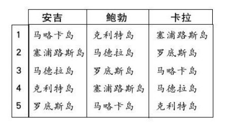 鲍勃的第二个选择是马德拉岛(线索1),所以马德拉岛不可能是安吉首选的岛(线索3)。线索5结合线索3,排除了安吉把克利特岛或塞浦路斯岛排第一的可能性,同时没有人把罗底斯岛排第一(线索6),所以安吉的第一选择是马略卡岛,同时它也是鲍勃的第五个选择(线索3)。现在已知线索5中的岛排行不在第一、第二、第四,又因为克利特岛不在任何人的第三排名里(线索1),所以,安吉把克利特岛排在第四,而鲍勃的第4是塞浦路斯岛(线索5)。已知鲍勃不可能把罗底斯岛排第一位(线索6),同时我们已经知道了他的另外3个选择,所以他一定是把克利特岛排第一位,罗底斯岛是第三位。卡拉将罗底斯岛排在第二位(线索4)。由于鲍勃把马略卡岛排在最后一位,线索2排除了在安吉或卡拉的列表里塞浦路斯岛是第三位和马略卡岛是最后一位即第五位的可能性。所以,由线索2得出,唯一的可能是在卡拉的列表上,塞浦路斯岛排第一,马略卡岛第三。因此,根据线索1,卡拉把马德拉岛排第四,克利特岛排第五。因为马德拉岛和罗底斯岛分别被鲍勃和卡拉排在第二位,安吉不可能把两者之一排在第二位,所以安吉的第二选择是塞浦路斯岛。同样的,鲍勃把罗底斯岛排在了第三位,安吉就不可能排罗底斯岛在第三位,所以她把罗底斯岛排第五位,马德拉岛排第三位。