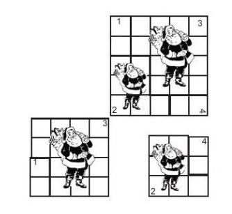 拿起笔和尺子,将正方形画成25个小正方形(如图1所示)。再将正方形切成4块儿(沿着深色线切),把这4块儿标成1至4部分。如果你按照图2和图3将这4部分重新拼的话,那么,你会拼成2个正方形,而每个正方形都各有一个完整的圣诞老人。