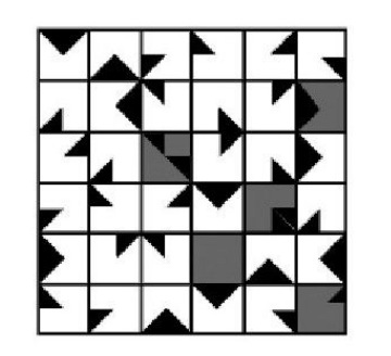 每一行中的黑楔形都可以构成一个完整的正方形。