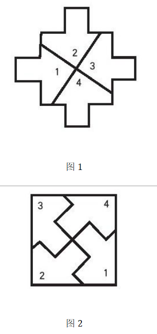 先按照图1的样子切开,然后按照图2所示将它们拼成一个正方形。