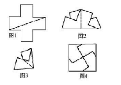 先沿图1的虚线折叠,然后再沿图2的虚线折叠,最后沿图3的虚线折一下,并沿这条线剪一刀,就把“十”字形分成了4块相同的图形,把它们拼起来,就是一个正方形了。