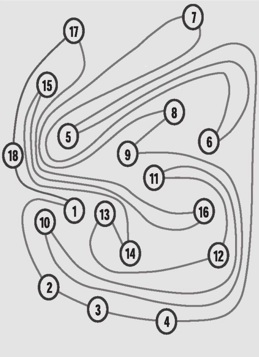 答案如图所示。原题中选的是18个点,其实用任意多少个点都可以做到把它们从头到尾相连,且连线不相交。