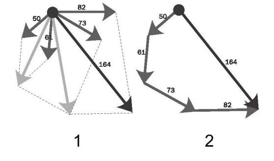 可以把每2个力相加,按顺序算出它们的合力,直到得到最后的作用力,或者把它们按照下面所示加起来。