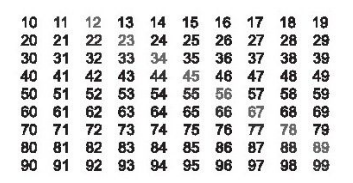 题1:一共有90个两位的阿拉伯数字,如下图所示。在它们之中有8个有连续的数字,所以答案是82个两位数。