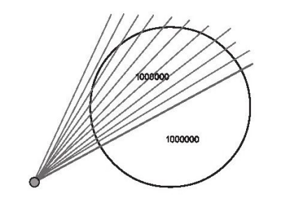 如果射线一次扫射正好从999999个点到了1000001个点,那就只能在圆外面另选一个点,重新来试,最后总有一条线会成功的。这就是所谓的馅饼理论的一个简单例子。