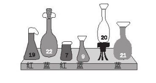 空烧瓶的容积必须是被3除余数为2的1个数(因为蓝色的液体是红色液体总量的2倍),而在已给出的6个数中,只有20满足这一条件,因此容积为20的是空烧瓶。剩下的5个烧瓶的总容积为78,它的1/3应该为红色液体,即26;剩下的52为蓝色液体。由此得到最后的结果,如图所示。