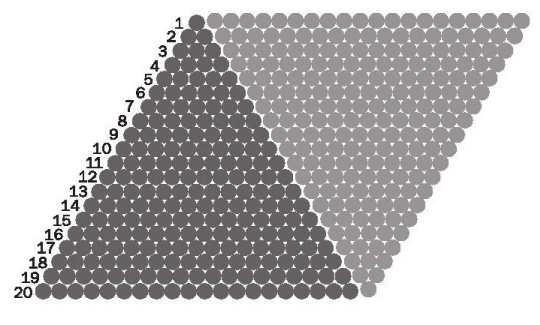 如图所示,想象有两个这样的金字塔,它们正好拼成1个平行四边形,从图中可以很直观地看出这个平行四边形有20横行,21纵行,那么组成这个平行四边形需要20×21=420个演员,两个金字塔需要420个演员,那么一个金字塔则需要210个演员。