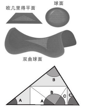 除了欧几里德平面,还存在球面和双曲平面,在球面上的三角形3个内角之和大于180°,而在双曲平面上的三角形内角和则小于180°。