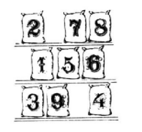 在第一层,将布袋(7)和(2)交换,这样就得到单个布袋数字(2)和两位数字(78),两个数相乘结果为156。接着,把第三行的单个布袋(5)与中间那行的布袋(9)交换,这样,中间那行数字就是156。然后,将布袋(9)与第三行两位数中的布袋(4)交换,这样,布袋(4)移到右边成为单个布袋。这时,第三行的数字为(39)和(4),相乘的结果为156。总共移动了5步就把这个题完成了。