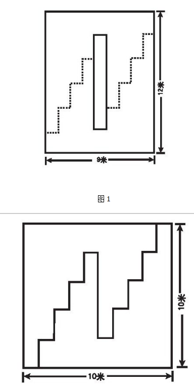 他先沿着图1中虚线把地毯剪开,然后,再把上半部分的地毯向左下方移动,这样,就正好可以与下半部分的地毯合并在一起(参见图2)。然后,将它们缝合成一个完整的正方形地毯。