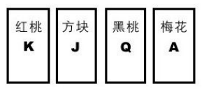 这4张正面朝下的扑克牌从左到右依次是红桃K、方块J、黑桃Q、梅花A。