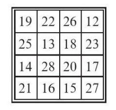 下面是解答的方法。值得注意的是,这个方格4个角上的数字以及中央的4个数字相加的结果也是79。当然,除此之外还有其他几组4个数字相加的结果也是79。看看你能找到多少个。