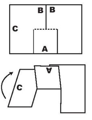 准备一张硬纸,按下图的样子将它剪三下,每次剪到纸张的中间部位。将内折边A沿着中间线折起来,使它与BB边垂直。将C边旋转180°。接着,将这张纸放在桌子上面。这时,你会发现这个著名的“看似不可能的纸张”已经完成了。