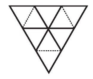 图中虚线所示的3根棍子就是应从图形上拿走的棍子。这之后图形上就剩下3个小三角形、3个中型三角形以及1个包括所有三角形的大三角形。毕竟,这位女士并没有指明这7个三角形必须一样大。
