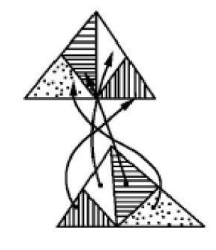 因为是不等边三角形,翻成反面时会变形,因此,只要将翻成反面也不会变形的部分分割成几个等腰三角形,再缝合起来即可。要分割成数目最少的等腰三角形,如图所示,只要分割成4片就行了。